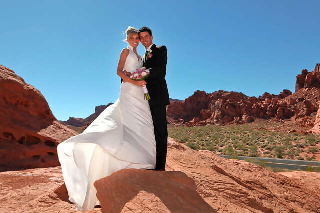 On your big day you will be picked-up from your Las Vegas hotel and driven in luxury to the courthouse to collect your marriage license. With documents in hand you will continue for the 45-minute drive to the Valley of Fire. The red rock formations which have formed over thousands of years form a stunning backdrop for your special day. Your minister will perform the marriage ceremony and then a professional photographer will capture 100 beautiful wedding pictures in various scenic locations.